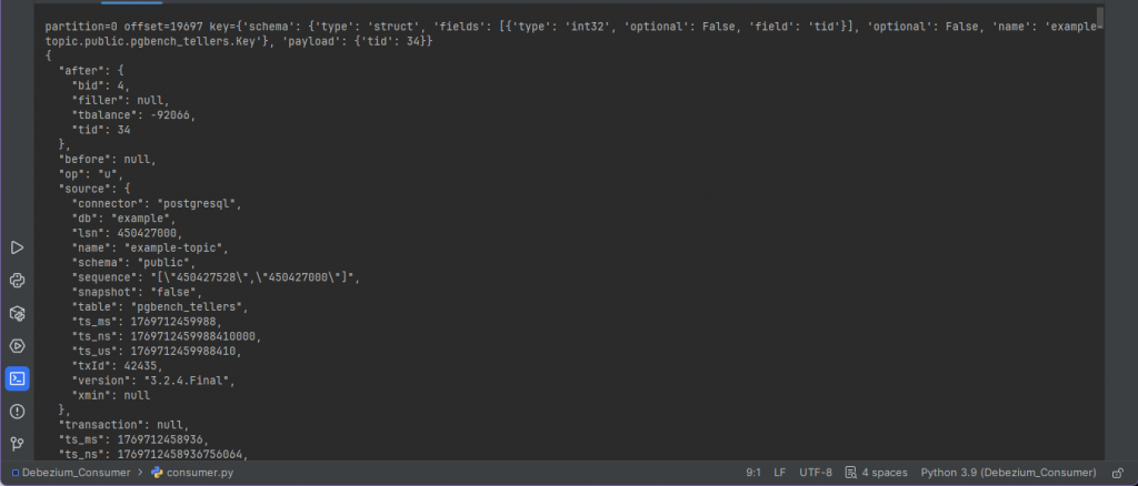 |19699|192.168.126.1 |logical_replication_user|Debezium Streaming|streaming|0/1B0A9690|0/1B09B460|0/1B09B460|4906.965 |114990.367 |114990.367 |
